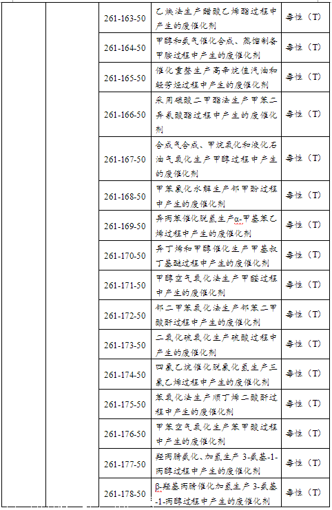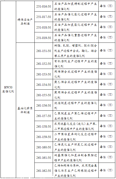根據(jù)《國(guó)家危險(xiǎn)廢物名錄》(2016版),HW50廢催化劑來(lái)源于精煉石油產(chǎn)品制造、基礎(chǔ)化學(xué)原料制造、農(nóng)藥制造、化學(xué)藥品原料藥制造、獸用藥品制造、生物藥品制造、環(huán)境治理等行業(yè),主要包括石油產(chǎn)品催化裂化過(guò)程中產(chǎn)生的廢催化劑;樹(shù)脂、乳膠、增塑劑、膠水/膠合劑生產(chǎn)過(guò)程中合成、酯化、縮合等工序產(chǎn)生的廢催化劑;有機(jī)溶劑生產(chǎn)過(guò)程中產(chǎn)生的廢催化劑;化學(xué)原料制備過(guò)程中產(chǎn)生的廢催化劑以及廢汽車尾氣凈化催化劑等。